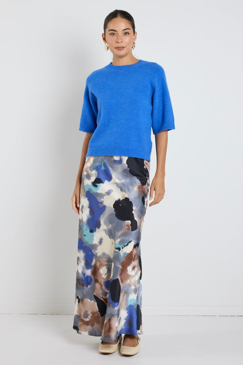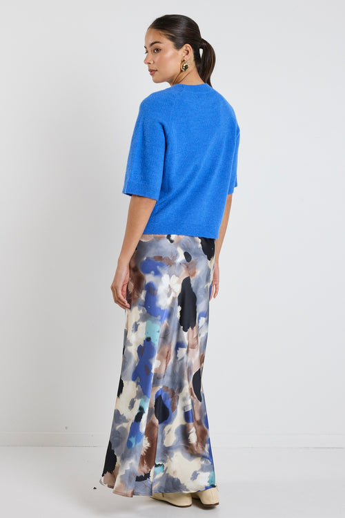 Model wears a blue multi watercolour maxi skirt with a blue short sleeve top