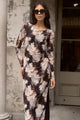 Elevate your wardrobe with this stunning long sleeve floral dress, featuring a rich sepia-toned print. Made with delicate mesh fabric and subtle ruching details, this lined dress offers a flattering fit and a graceful silhouette. Made from a soft blend of 90% polyester and 10% elastane, it combines comfort with a touch of stretch. Perfect for both daytime and evening occasions.