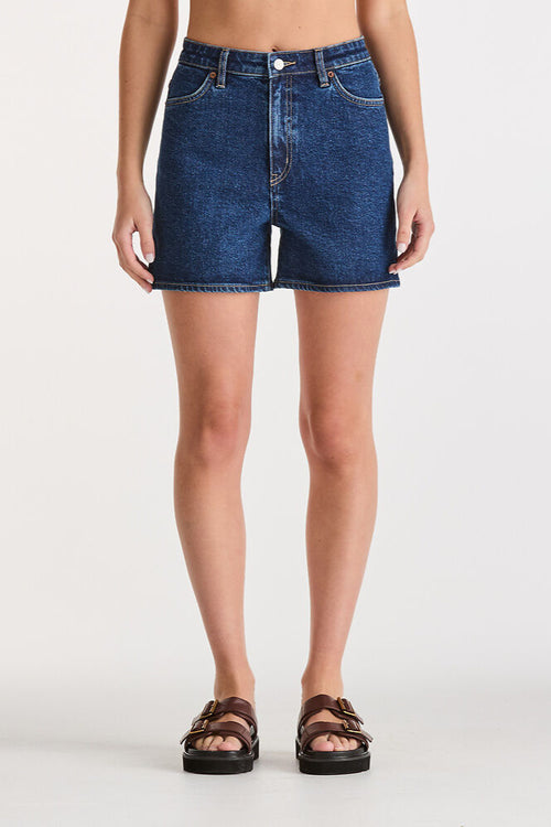 A summer staple, our Girlfriend Short is our signature relaxed short. It sits high on the waist, fitted on the hips, but is more relaxed through the thigh and hem so you have plenty of room to move. Made in a dark indigo wash, that gives you the look of vintage denim with the comfort of hidden stretch.