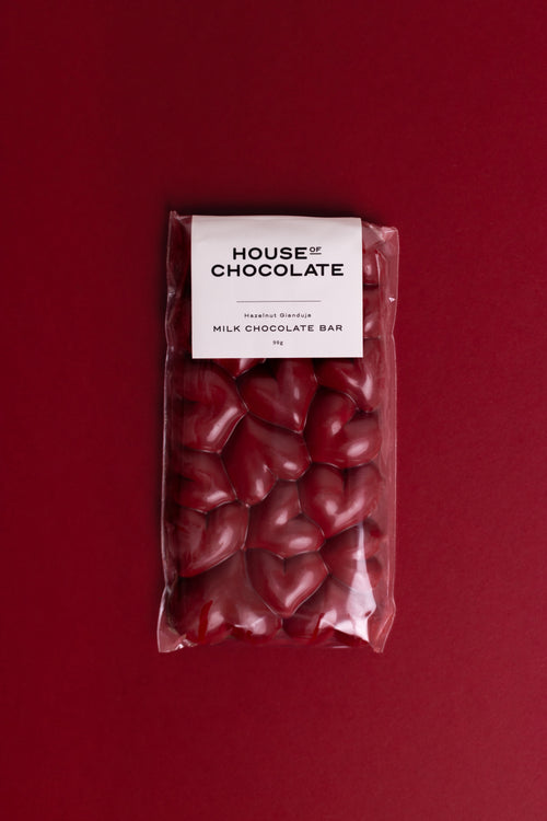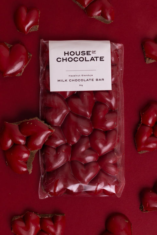 Indulge in the Love Heart chocolate bar. Handcrafted with creamy hazelnut praline gianduja blended with smooth 37% cacao couverture milk chocolate. Shelled in a lots of love mould, finished with red cocoa butter.