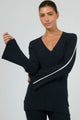 model wears a black long sleeve V neckline top
