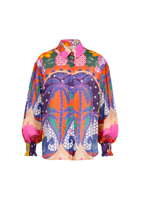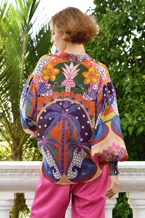 Add a playful pop to your wardrobe this season with the strongly hued ‘Siesta Fiesta’ cotton voile. Showcased in the ‘Island Hop’ shirt, this signature COOP fabric spells out holidays. Featuring a simple button through front, and gathered sleeves that cinch to a shirred cuff, this shirt needs only a simple pant to make a fabulous outfit.