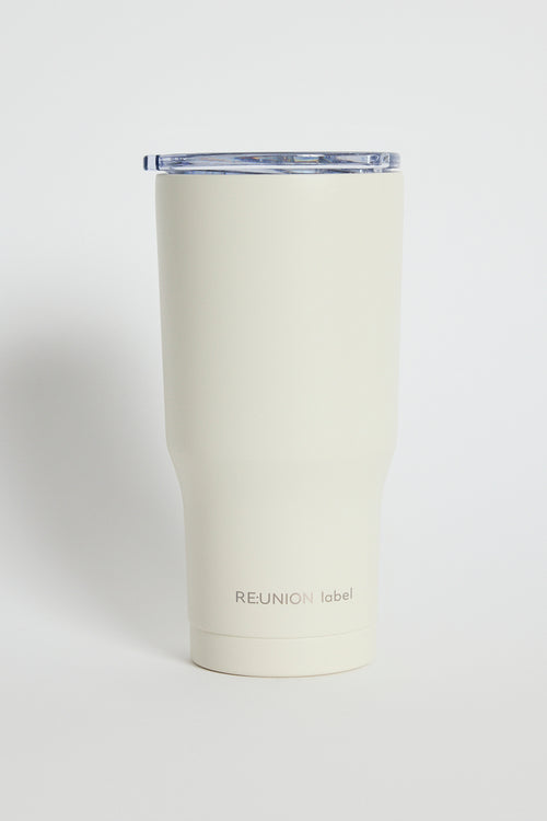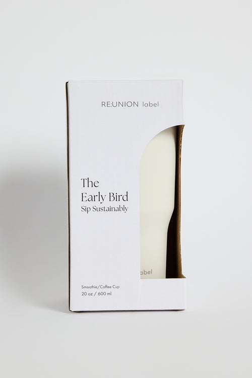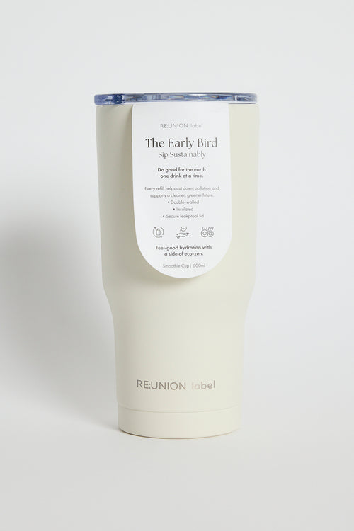 The Early Bird Ivory Smoothie Cup from RE:Union Label. The perfect reusable cup for your daily hit of vitamins or caffiene. Ready for everyday use, this white stainless steel coffee cup holds 600ml of liquid.