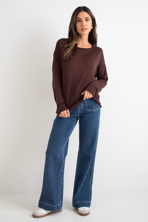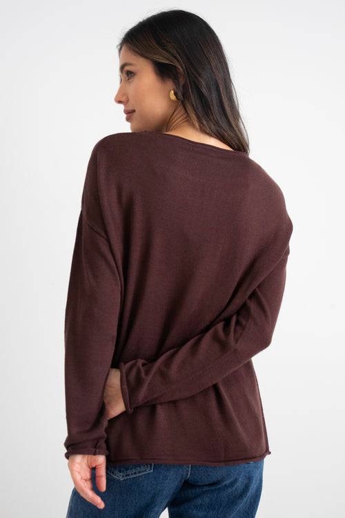 Elevate your everday with this classic chocolate knit, Its soft fine knit drapes beautifully on the body, while the relaxed shape and raw-edge details keep things casual but elevated. This is the kind of piece that goes with everything, making high-to-low dressing an absolute breeze.