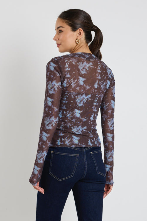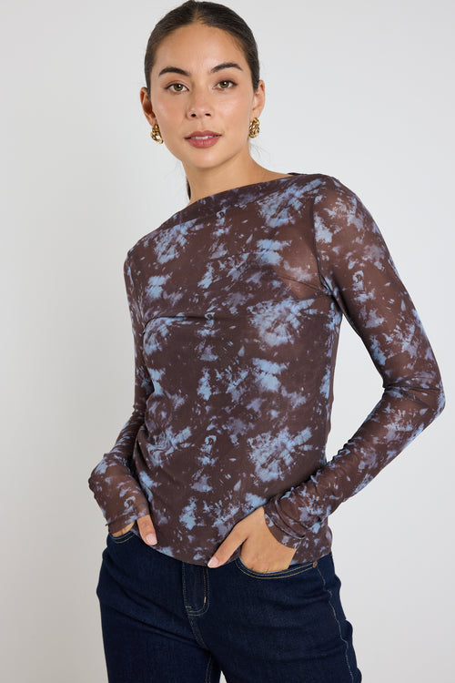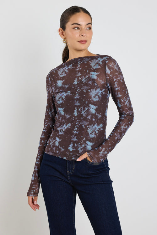 This long sleeve style features a flattering high boat neckline and a slim, form-hugging silhouette crafted from a lightweight, sheer mesh fabric. The unique tie-dye pattern blends earthy browns with soft icy blues, offering a moody yet elevated look that layers beautifully under vests, blazers, or chunky knits. Whether you're dressing it up with tailored pants or keeping it casual with your favourite denim, this top is your go-to for effortless cool-girl style.