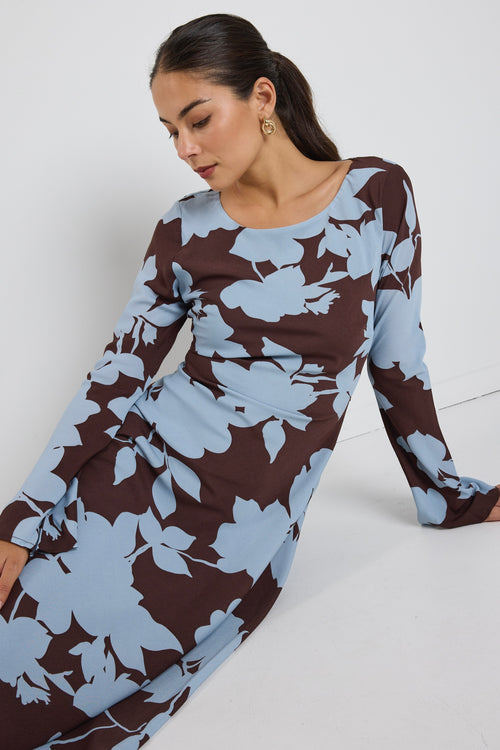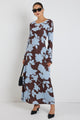 model wears a long sleeve brown and blue floral maxi dress