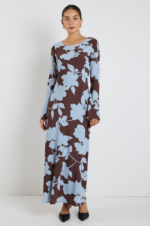Luminous Brown Blue Floral Fluted Sleeve Bias Maxi Dress