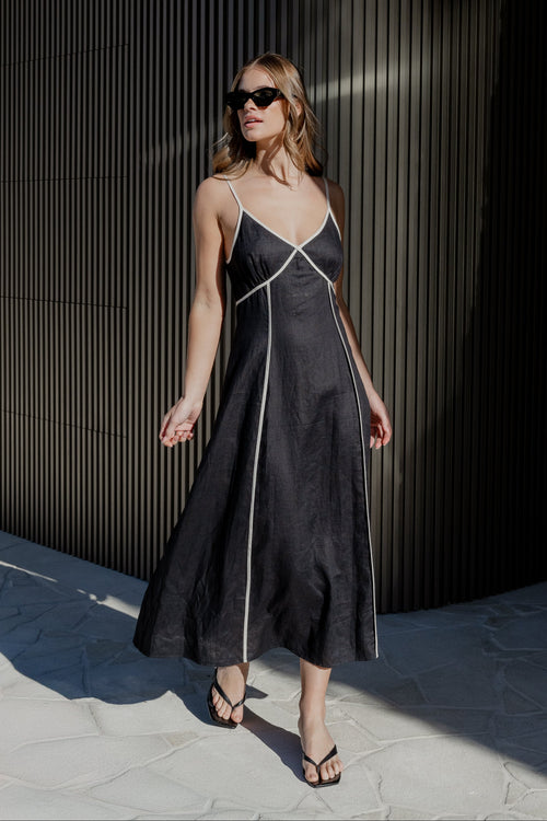 Marine Black Contrast Piped Linen Strappy Maxi Dress