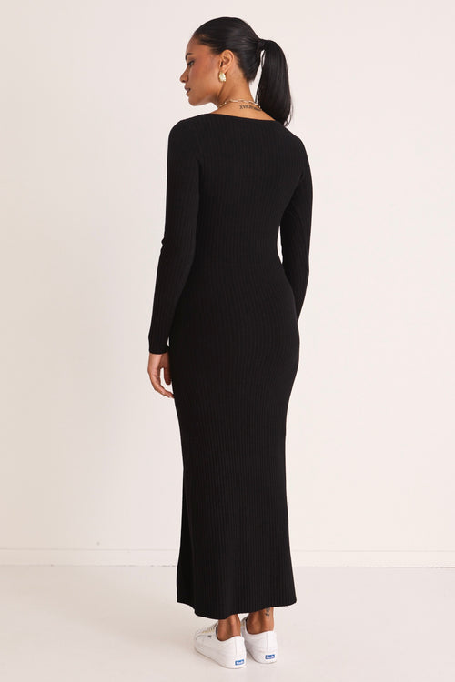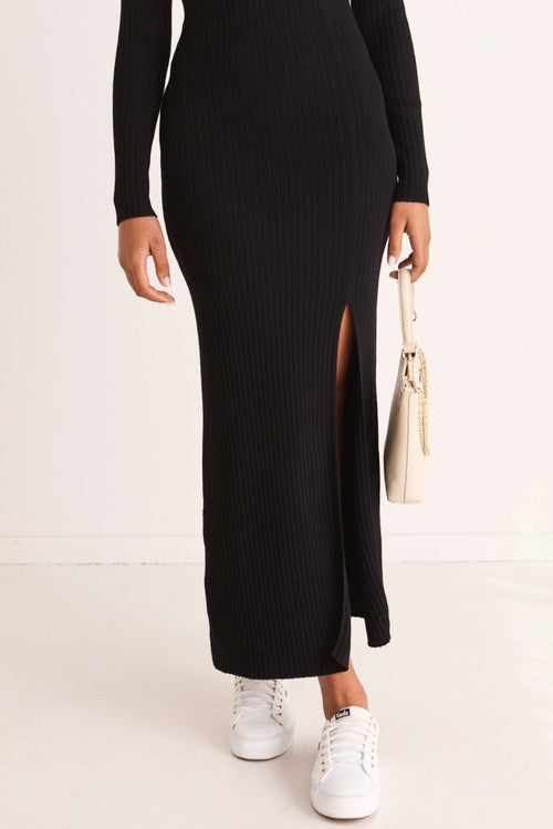 Nirvana Black LS Rib Knit Split Front Maxi Dress