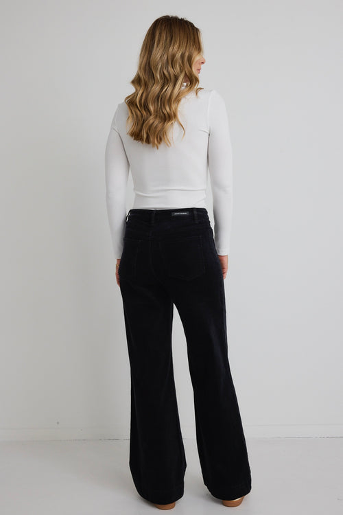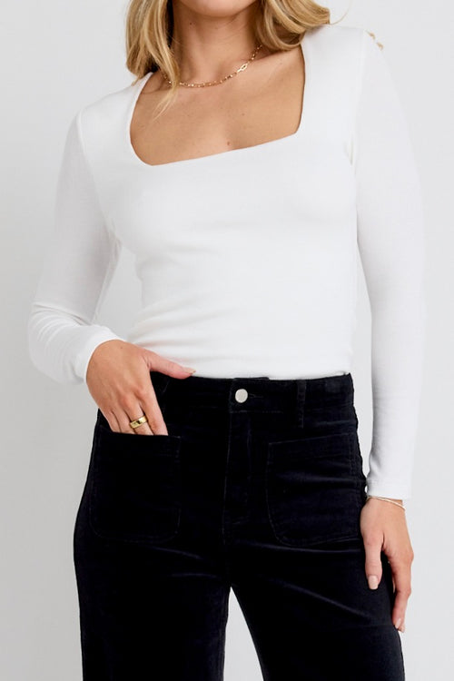 A woman wearing a fitted cream long-sleeve top with a square neckline, styled with black high-waisted cord jeans.