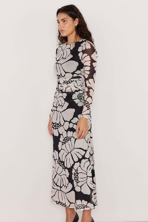 The cult-favourite mesh dress is back - now in a bold new monochrome. The Persephone Mesh Maxi Dress features the same figure-hugging silhouette you love, with a soft sheer overlay and eye-catching floral print. Effortlessly cool and ultra-flattering, this piece is made for after-dark plans or elevated day-to-night dressing.