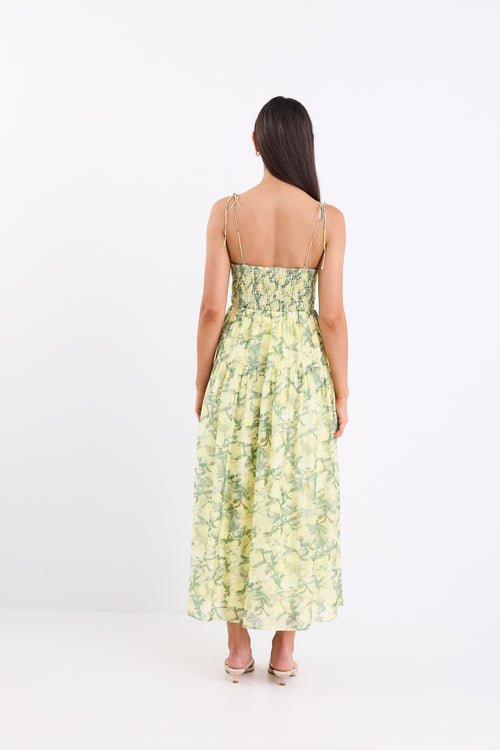 Bring a touch of sunshine to your wardrobe with the Positano tiered maxi dress. Designed in a dreamy yellow and green botanical print, this flowing silhouette radiates relaxed elegance and feminine charm. The ruched bodice and adjustable tie straps create a perfectly flattering fit, while the tiered skirt adds gentle movement for an effortlessly graceful finish.