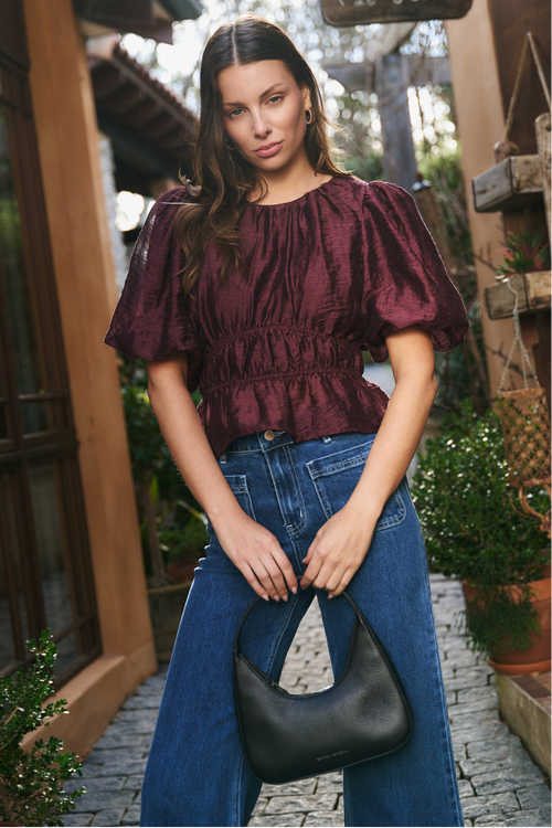 The Prompt burgundy puff sleeve top from Georgia Zoe is a delicate yet statement-making style. Featuring short puff sleeves and a gathered waistline, this plain design offers a flattering, feminine silhouette. Designed with delicate garment care in mind, this versatile top pairs effortlessly with denim or tailored bottoms for both casual and elevated looks.