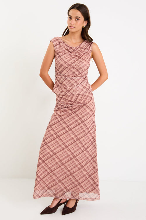 Quench Blush Check Mesh Panelled Maxi Skirt