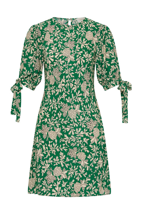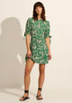 The Raelynn Mini Dress in the fresh apple green Cyrus print features a round neckline, back keyhole closure, puff sleeves with tie details, and a bias-cut silhouette that flatters your shape, falling gracefully to a playful mini hem.