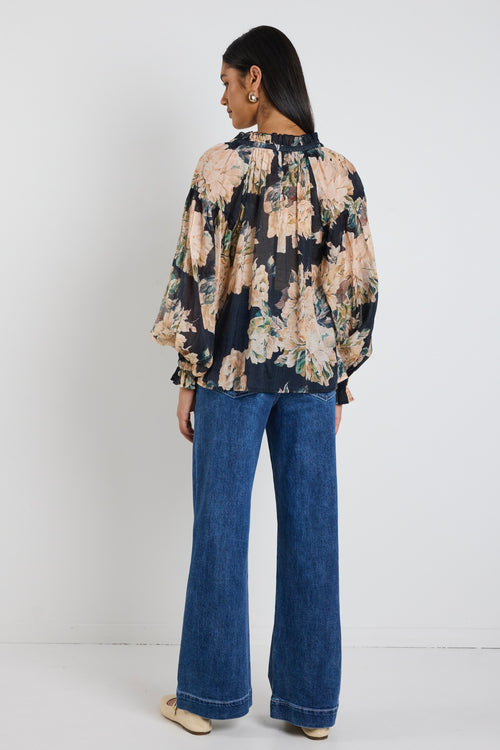 Woman wearing a navy floral long sleeve blouse with wide-leg indigo jeans and a black handbag, posing outdoors in natural light.