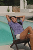 Woman wearing a blue and white checkered top and white shorts outdoors.