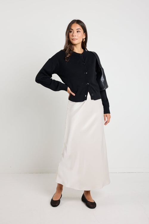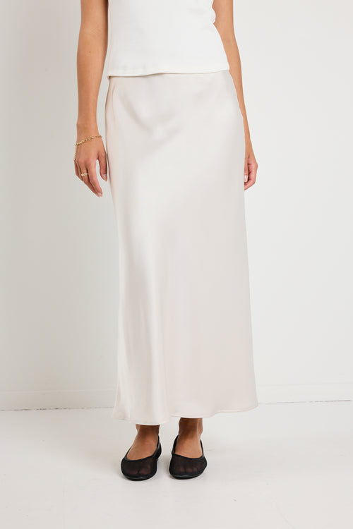 The Rosette Pearl Satin Bias Midi Skirt is crafted from smooth satin with a soft sheen. Cut on the bias for a graceful flow, it features a midi length and an elastic waistband for comfort. The midi length and lined construction provide full coverage, ensuring that you feel both stylish and comfortable throughout the day. Available in a pearl colour, this skirt is perfectly suited for a sophisticated look.