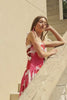 Woman wearing a floral pink and red ruched midi dress with tie-up straps and a flared hem, styled with minimal sandals.