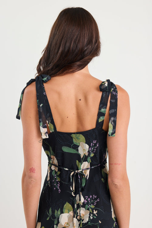 The Serenade dress is soft, floaty and full of romantic charm. With a black base scattered in blush-toned blooms, this silhouette flatters with its gentle shaping and flowing movement. The tie-up straps add a playful finish and let you adjust the fit just how you like it.