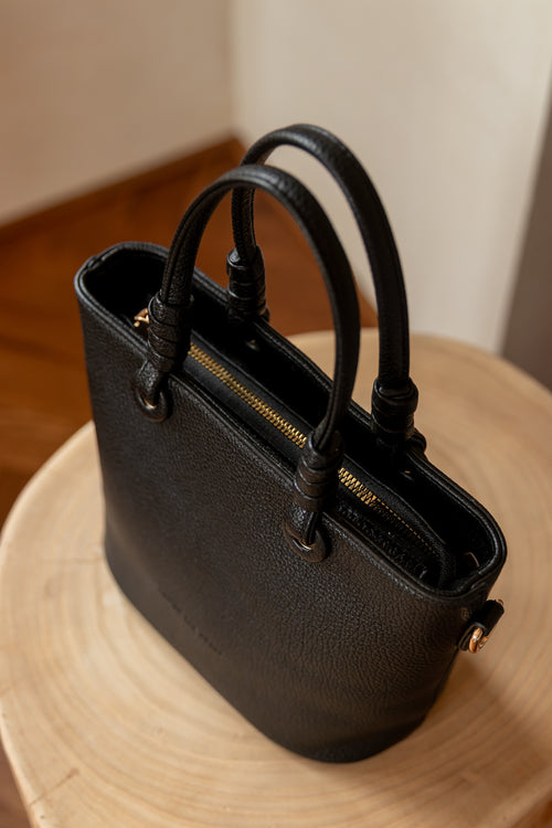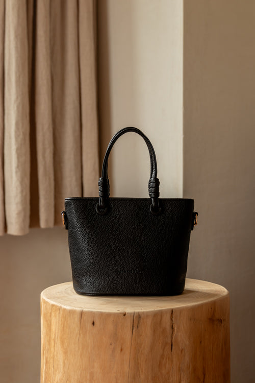 Chic, compact and easy to carry, the Siena Bag is your everyday go to. The smooth black PU leather gives it a sleek finish, while the signature knotted top handles add a stylish twist. With a detachable crossbody strap included, it moves effortlessly from hands free days to polished evening moments.