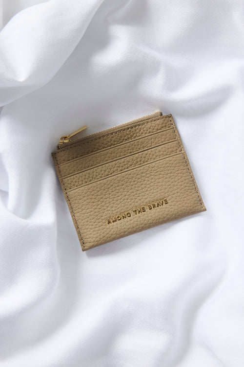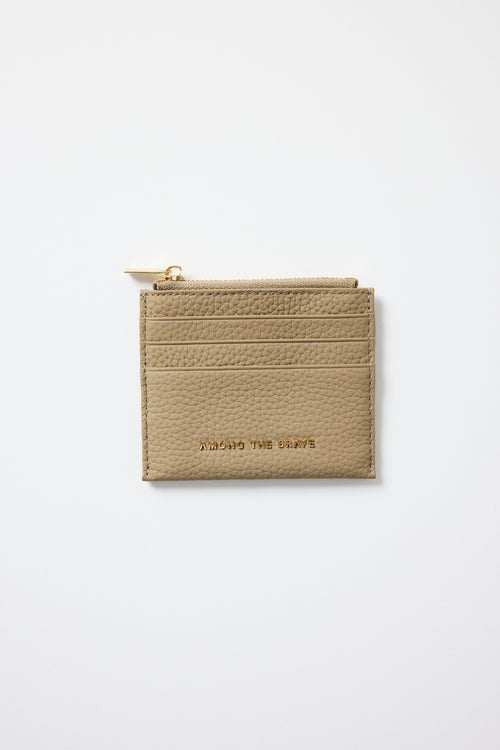 Compact and stylish, the Small Leather Card Holder by Among The Brave is your perfect on-the-go companion. Crafted from premium leather, it features a sleek gold embossed "Among The Brave" logo and a matching gold zip closure. Designed for convenience, it includes front card slots for easy access and a secure zip pocket for your coins.
