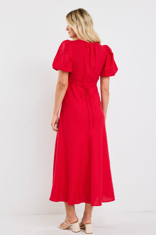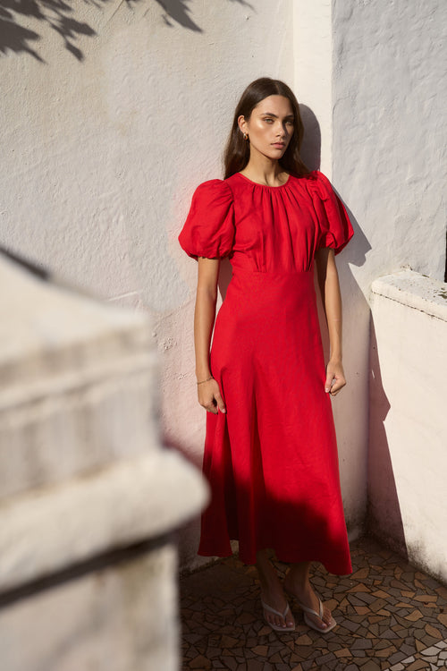 Make a bold statement in the Stage Cherry Dress, a stunning piece that blends timeless elegance with a modern silhouette. Designed in a rich cherry red, this dress features dramatic puff sleeves and a flattering fitted waist that flows into a graceful maxi-length skirt. The breathable linen-viscose blend ensures comfort while maintaining a structured yet effortless look.