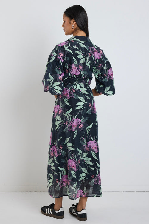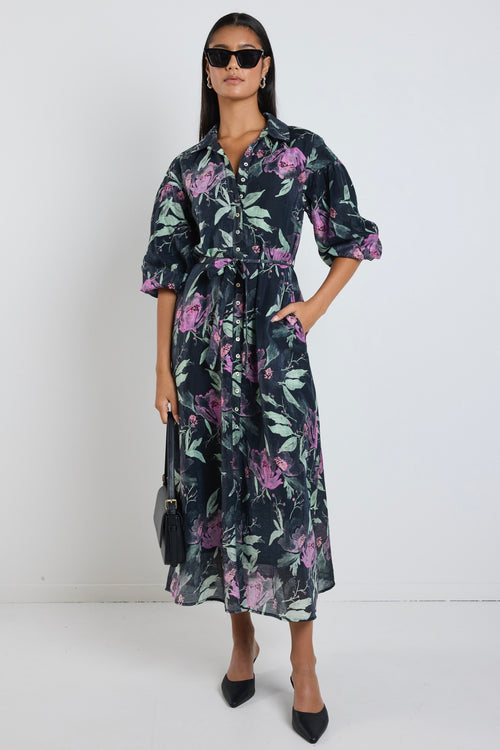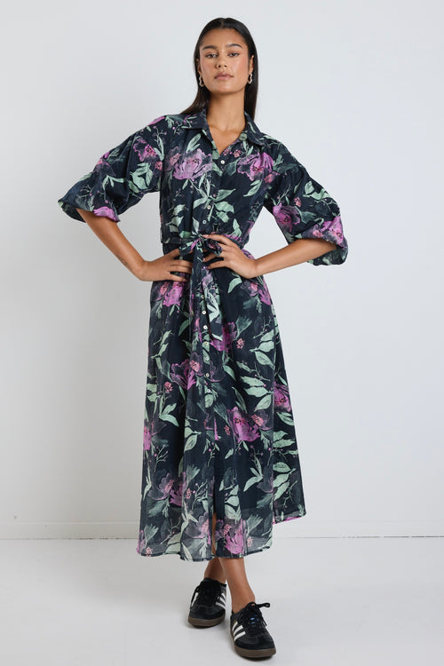 Studio Petrol Lilac Floral Balloon Sleeve Midi Shirt Dress