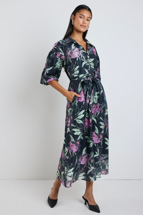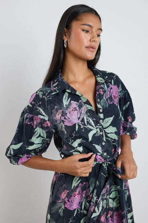 Model wears a black lilac floral maxi tie dress with a collar and button down