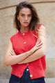 Woman wearing a sleeveless red knit vest with gold buttons down the front, styled with dark denim and loose blonde waves.