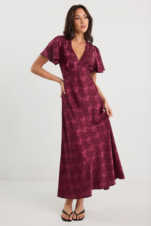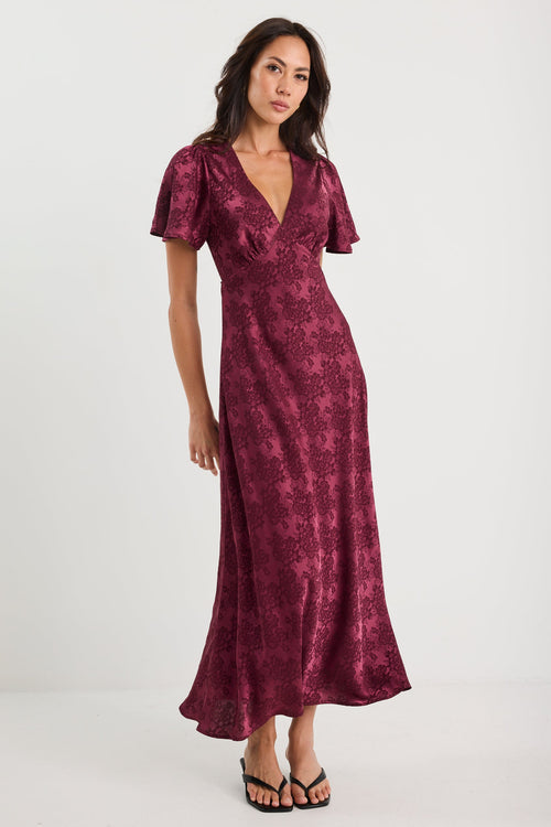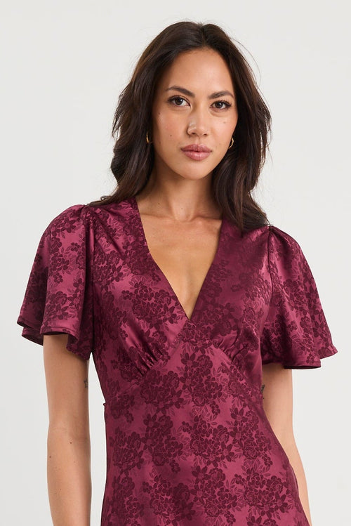 - Short flutter sleeves - Bias cut for elegant drape - V neckline - Subtle floral jacquard design - Flared hem for movement - Fully lined - Fabric Composition - 100% Polyester - Garment Consumer Info - Delicate care advised