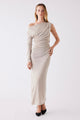 Classic elegance is found in the Transmit Golden Sparkle Dress from Esmaee. An asymmetrical neckline cuts a flattering line across the shoulders which drops into a singular sleeve. This midi dress features a side slit to help it easily move as you go about your day.