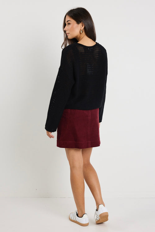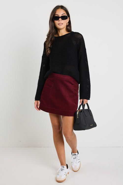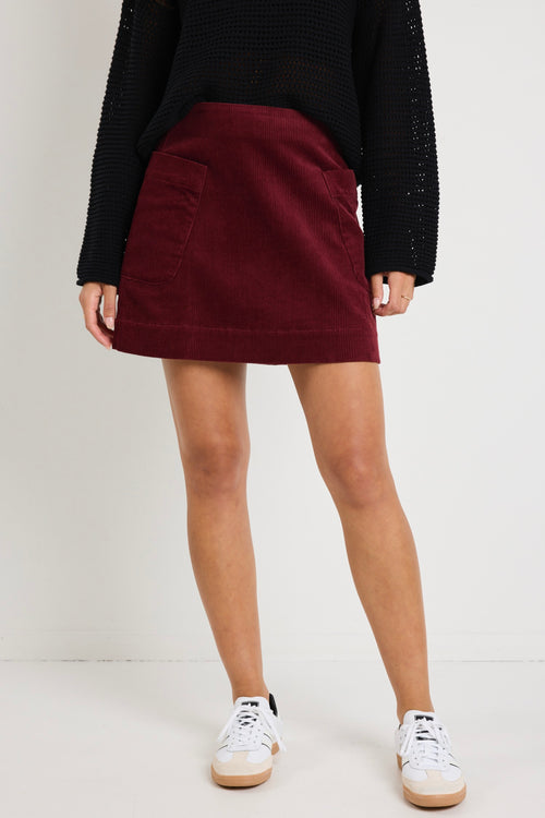Add a pop of color to your wardrobe with this mini red cord skirt. Crafted from soft corduroy, it features a flattering A-line silhouette, a high-rise fit, and functional pockets.