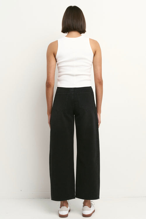 Woman wearing high-rise, wide-leg black jeans styled with a white ribbed tank and white sneakers against a minimal white background.