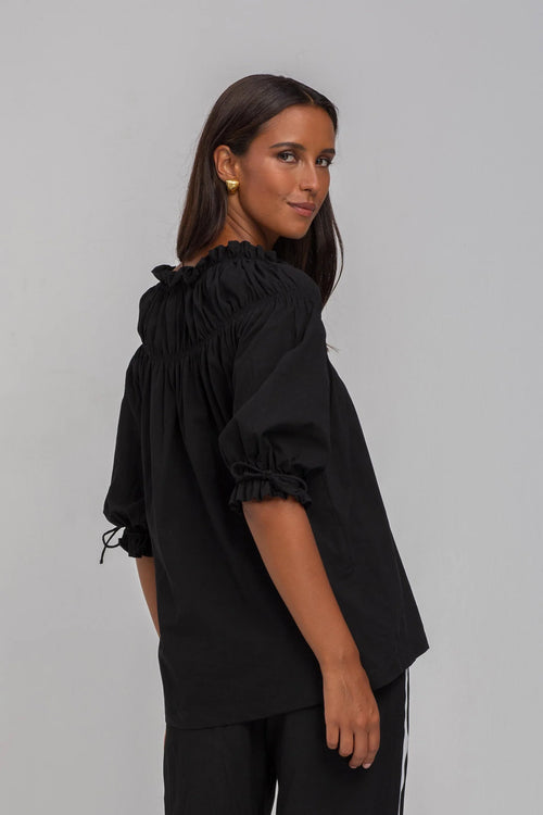 Introducing the highly sought after With Hope Top in black - crafted from premium washed cotton. Its boat style neckline, complete with elastic and a gathered frill, adds an exclusive touch. The elastic gather detailing above the bust creates a full-bodied, sophisticated look. The elbow-length sleeves, featuring elastic and a rouleau tie with a hem frill, add to the elegance. The top is finished with a straight hem at mid-hip, giving it a tasteful and refined look.