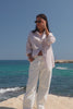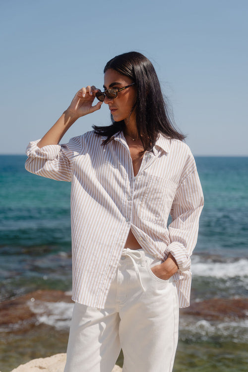 The You Got This Ecru Stripe Poplin Oversized Shirt is made from breathable cotton poplin. It features an oversized fit, button-down front, structured collar, chest pocket, and cuffed sleeves. Style with wide-leg trousers or layer over a slip dress for a relaxed look.